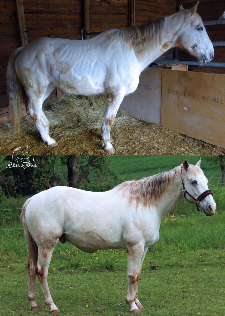 Wenige Wochen nach der OP sah man Blue seinen Lebenskampf deutlich an. Er hat extrem abgebaut und wirkte mit einem Mal schlagartig „alt“. Blue war müde, abgekämpft und extrem klapprig. Er wäre ohne Probleme als „Tierschutzpferd aus schlechter Haltung“ durchgegangen. Zur Untersuchung der Lunge und dem Darm bekam er einige Stellen geschoren. Deswegen musste er den Winter mit einer Decke verbringen. Sofern es die Temperaturen zugelassen haben kam die Decke runter. Aber weil sein Körper ja einen kompletten Crash hatte wollte niemand riskieren, dass er sich nachher noch die nächste Lungenentzündung oder Erkältung einfängt. Zumal er ja nicht die Möglichkeit hatte sich zu bewegen. Nach 8 Wochen durften wir dann sogar die erste Tritte traben und ganz ehrlich, ich habe es mir schlimmer vorgestellt. Blue lief wirklich gut, natürlich nicht ganz rund, aber nach so einer langen Stehzeit und aufgrund seiner Arthrose erstaunlich gut. Theoretisch wäre Schrittreiten ab der 9. Woche erlaubt. Für mich kam das jedoch nicht in Frage, da Blue so extrem abgebaut hat, dass ich mich ruhigen Gewissens niemals hätte drauf setzen können. Außerdem hatte Reiten bei uns eh nie so den großen Stellenwert und das Thema hatte ich bereits bei der OP schon für einige Monate abgehakt. Zusätzlich sollte Blue erst Mal von meiner Physiotherapeutin durchgecheckt werden. Das sollte man nach so einer OP m.M.n. immer machen. Bei Blue war auch gefühlt alles schief, verspannt und nicht da wo es hingehört. Leider musste bei Blue so viel behandelt werden, dass wir nach einer gewissen Zeit abbrechen mussten. Die schlimmsten Probleme konnte man zwar beheben, aber es war trotzdem eine Nachbehandlung erforderlich. Bei der Nachbehandlung gab es dann auch viel Lob. Einige Probleme waren zum Teil schon komplett verschwunden, weil wir brav unsere Hausaufgaben gemacht haben. Und die schwereren Probleme waren auch deutlich besser. Ich empfehle jedem eine Behandlung nach so einer OP. Meine Physiotherapeutin hat mir so viele Dinge gezeigt die ich machen sollte oder wie ich Blue anderweitig unterstützen kann, dass uns das sehr geholfen hat. Insgesamt sieht Blue mittlerweile wieder richtig gut aus und hat auch wieder Muskulatur aufgebaut. Da habe ich ihn zum einen mit dem Olimond BB power übers Futter unterstützt und auch viel mit den SureFoot Pads gearbeitet. Obwohl das Wetter und die Bodenverhältnisse schlecht waren, konnten wir mit den Pads und etwas Handarbeit eine gute Grundlage schaffen. Mit der Entwicklung bin ich wirklich sehr zufrieden.