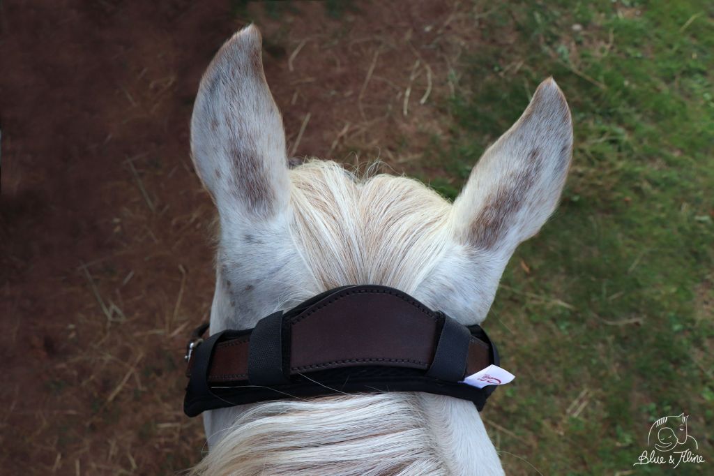 Dann nutze ich noch den Genickschoner von Ceratex. Der anatomisch geformte Schoner sorgt dafür, dass der Druck gut aufgefangen wird. Die Ohren können sich frei bewegen und gerade mein gebissloser Reit- und Kappzaum haben eine ähnliche Form im Genick. Ich nutze ihn daher sehr gerne, wobei er auch an jeglichen anderen Zaumzeugen verwendet werden kann. Durch das zusätzliche Polster sollte man jedoch gerade Trensen anpassen. Oftmals reicht es, wenn man die seitlichen Riemen ein Loch länger einstellt. Durch die Wirkung des Keramikstoffes wird die Muskulatur im Genick positiv beeinflusst, was zu mehr Losgelassenheit führen kann. Vor allem Pferde die hier sehr empfindlich sind reagieren positiv darauf. Blue hat auch hier keine nennenswerten Probleme, trotzdem freue ich mich, wenn ich ihm damit ein wenig Entspannung bieten kann. Es ist übrigens der einzige mir bekannte Keramikstoff Genickschoner mit einer anatomischen Form.