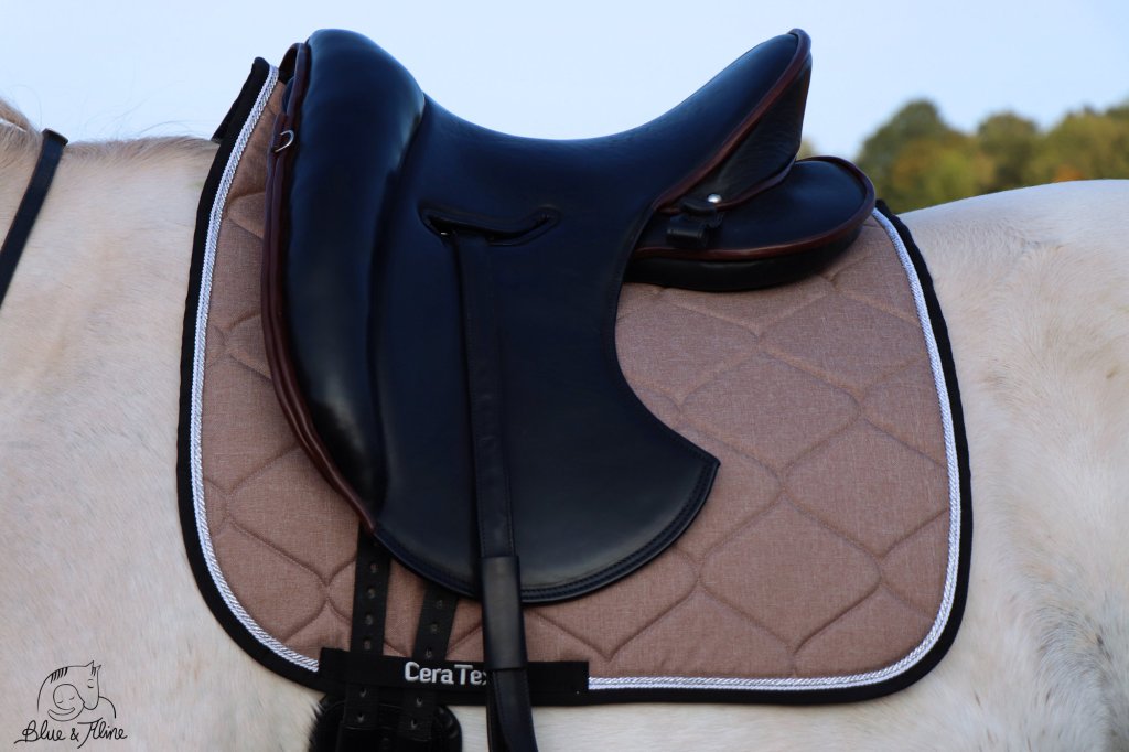 Außerdem habe ich mittlerweile auch eine Schabracke von Ceratex. Die ist nicht nur Optisch ein Hingucker, sondern hat auch andere positive Eigenschaften. Neben dem keramischen Material ist sie schmutzabweisend, anatomisch geformt und hat eine stabile Form. Bei der Schabracke merke ich gerade an kälteren Tagen, dass Blue schneller im Rücken los lässt. Die Schabracke transportiert den Schweiß nach außen und fühlt sich nicht nass an. Außerdem trocknet sie sehr schnell. Gerade im Fellwechsel ist die Schabracke ganz angenehm, weil sich Haare schnell entfernen lassen. Ich liebe diese Schabracke wirklich und obwohl sie etwas heller ist, kann man sie problemlos auch in der „dreckigen“ Jahreszeit nutzen. Sie ist total pflegeleicht und wenn Blue mal etwas fester im Rücken ist, tut sie ihm einfach gut. Glücklicherweise haben wir keine nennenswerten Rückenprobleme, aber trotzdem merke ich gerade bei nasskaltem Wetter einen Unterschied zu anderen Schabracken.