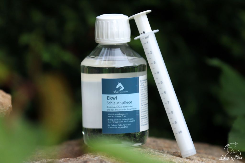 Mittlerweile habe ich mir angewöhnt regelmäßig die Ekwi Schlauchpflege von VTG Tiergesundheit zu nutzen. Die meisten Verunreinigungen werden durch das Öl sowie regelmäßiges ein- und ausfahren selbst gereinigt. Somit muss man gar nicht so viel machen, was je nach Pferd ja durchaus problematisch sein kann. Blue ist zum Glück sehr lieb und lässt da sehr viel mit sich machen. Wenn man ihn kratzt, fährt er den Schlauch meistens aus wodurch ich gut sehen kann ob alles ok ist oder dieser sehr verschmutzt ist. Aber nicht jedes Pferd ist so lieb, weshalb man versuchen sollte das etwas zu üben. Geht man an diese empfindliche Stelle immer nur dran, wenn etwas entzündet ist, wird das Pferd nicht so begeistert sein. Daher berühre ich Blue regelmäßig völlig selbstverständlich dort und gucke nach ob alles in Ordnung ist. Das Pferd verbindet das Ganze dann nicht nur mit negativen Erfahrungen.