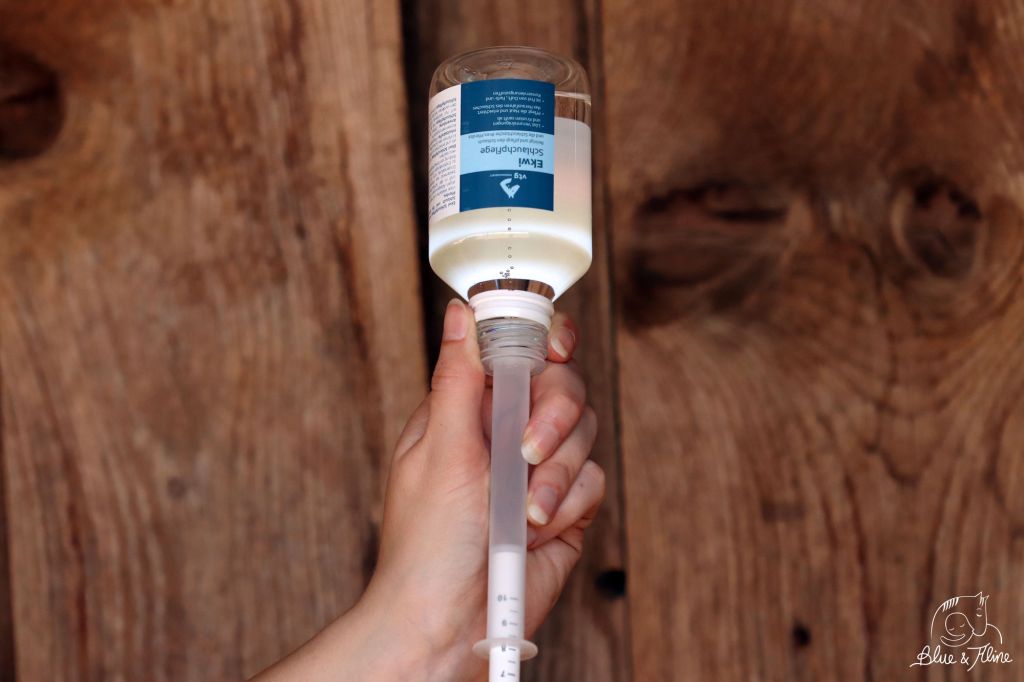 Anschließend zieht man die mitgelieferte Spritze mit 10 ml Schlauchpflege auf. Damit das Einführen leichter und angenehmer für das Pferd ist, benetzt man den vorderen Teil etwas. Danach führt man die Spitze der Spritze auf einer Seite sanft in die Schlauchtasche ein, appliziert das Mittel langsam in die Schlauchtasche und zieht die Spritze behutsam wieder heraus. Das ganze wiederholt man dann auch auf der anderen Seite der Schlauchtasche.